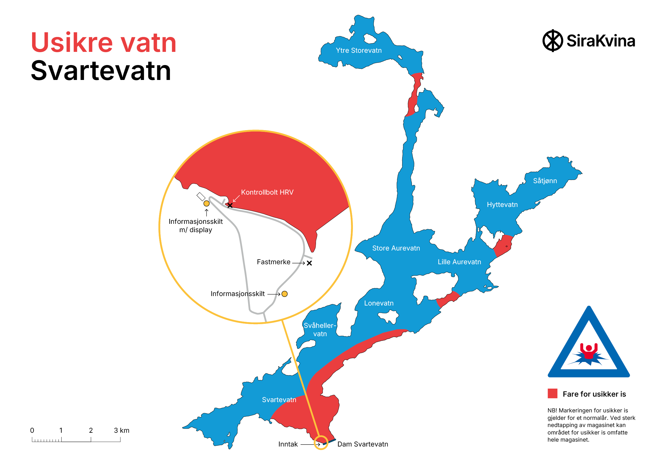 Isen på Svartevannsmagasinet er nå ikke farbar! OBS! Kommer du nordfra, f.eks. Storsteinen, så vær oppmerksom på at selv om isen virker trygg på Ytre Storevatn er den ikke det når du kommer lenger syd. I området fra Svartevassribbene og mot dammen / båtutsettet / steinbruddet er isen IKKE trygg.